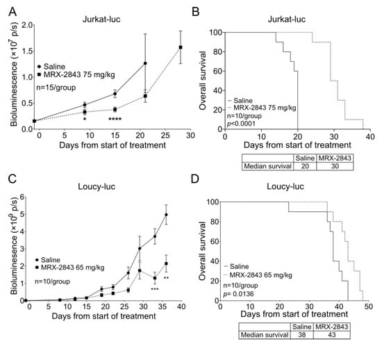 MRX-2843 monotherapy delays disease progression and prolongs survival in orthotopic T-ALL and ETP-ALL xenograft models. (A–D) NSG mice were injected with a luciferase-expressing T-ALL cell line cells and once-daily oral treatment with MRX-2843 or saline vehicle was initiated after engraftment of disease. (A,C) Disease burden was monitored at intervals by bioluminescence imaging. (B,D) Survival was monitored. (A,B) Mice inoculated with luciferase-expressing Jurkat cells were treated with 75 mg/kg MRX-2843 or saline for 28 days. (A) Mean bioluminescence intensities and SEM are shown (* p < 0.05, **** p < 0.0001, Mann–Whitney-U test, n = 15). (B) Survival was significantly prolonged in mice with Jurkat xenografts treated with MRX-2843 (p < 0.0001, log-rank test, n =10). (C,D) Mice inoculated with luciferase-expressing Loucy cells were treated with 65 mg/kg MRX-2843 or saline until removal from the study. (C) Mean bioluminescence intensities and SEM are shown (** p ≤ 0.01, *** p ≤ 0.001, Mann–Whitney-U test, n = 10). (D) Survival was significantly prolonged in mice with Loucy xenografts treated with MRX-2843 (p = 0.0136, log-rank test, n = 10).