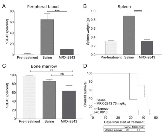 Treatment with MRX-2843 significantly reduced peripheral blood disease burden by 84.3% (Figure 6A) and splenic disease burden by 64.5% (Figure 6B) compared with saline-treated controls in the 0068TJ ETP-ALL PDX model. Although mice treated with MRX-2843 had a 34.7% reduction in bone marrow disease burden compared with pre-treatment controls (p < 0.01), there was no significant difference between mice treated with MRX-2843 compared with vehicle-treated controls (Figure 6C). However, survival was significantly prolonged from a median of 29 days in vehicle-treated mice to 41 days in mice treated with MRX-2843 (p = 0.0016; Figure 6D). A repeat experiment in this model produced similar results (Figure S3).
