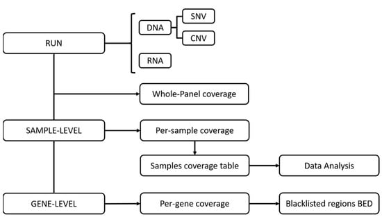 The procedure of the coverage analysis is implemented in the open-source genomic data indexing and management suite VarHound [9]. In addition to the distribution of MPC per run and exon coverage across samples, VarHound returns an output table for each run type, including a per-sample diagnostic table reporting quartile values for the exon percent coverage. The median of the exon percent coverage (Q2) was used to compare coverage data to wet and sequencing metrics. A list of BED format files included blacklisted regions (i.e., exons with unreliable coverage). Keeping track of blacklisted regions is of critical importance, since they might harbor false-negative variants (i.e., possible undetected malignant traits). Additionally, a base-level analysis detects narrow coverage drops within highly covered regions (exons). As a result, a coverage drops BED file, a gene-level drops file and related Genome Browser track file are generated. These small drops might hide false-negative variant calls in apparently covered regions. The VarHound diagnostics workflow is shown in Figure 1.
