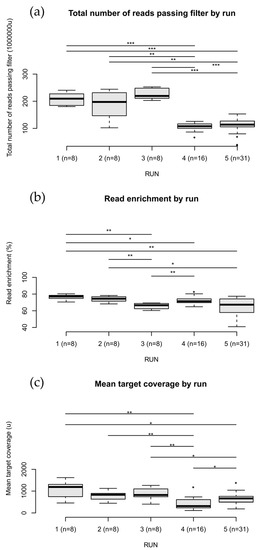 DNA sequencing quality metrics over 71 samples. Each boxplot shows the metrics distribution for the five runs. Pairwise comparisons between runs were done through a two-sided Wilcoxon rank-sum test (p-value: *** < 0.001, ** < 0.01 and * < 0.05). (a) Total number of reads passing (quality score > 30). (b) Read enrichment as the percentage of reads aligned on target over the total aligned ones. (c) Mean read coverage on the panel target probes.
