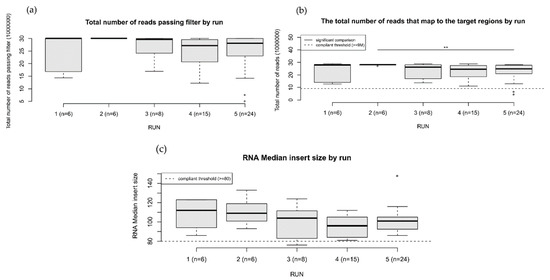 RNA sequencing quality metrics over 59 samples. Each boxplot shows the metrics distribution for the five runs. Pairwise comparisons between runs were done through a two-sided Wilcoxon rank-sum test (p-value: ** < 0.01). (a) Total number of reads passing (quality score > 30). (b) Total number of reads mapping to the target regions. (c) Mean read length (bp) by run.