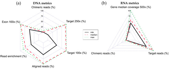 Radar plot reporting sequencing coverage and mapping quality metrics for 71 DNA (a) and 59 RNA (b) samples.
