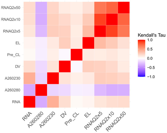 Kendall’s tau correlation coefficients between the RNA wet and sequencing coverage metrics.