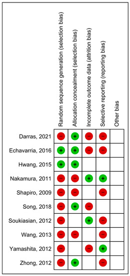 Risk of bias summary. Authors’ assessments of each risk of bias item for each study included. The green and red circles correspondingly represent a low and high risk of bias [8,12,13,14,15,16,17,18,19,20].