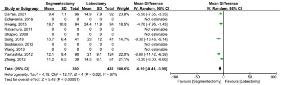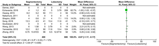 Five articles reported data on harvested lymph nodes and involved 873 patients (360 received segmentectomies and 513 lobectomies). Significant heterogeneity among the studies was demonstrated (I2 = 67%, p = 0.02). A significantly higher number of lymph nodes was harvested in minimally invasive lobectomies (MD = −6.19, 95% CI: −8.41–−3.98, p < 0.00001, Figure 3). Eight articles including 1607 individuals published data on postoperative complications (507 minimally invasive segmentectomies and 1100 lobectomies). Significant heterogeneity was observed among the studies (I2 = 57%, p = 0.02). The incidence of postoperative complications did not change substantially between the two groups (OR = 1.29, 95% confidence interval: 0.85–1.95, p = 0.24, Figure 4). Seven publications with 1099 individuals published data on postoperative hospital stay (343 minimally invasive segmentectomies and 756 lobectomies). The studies found no significant heterogeneity (I2 = 12%, p = 0.33). Postoperative hospital stay was significantly shorter for patients who underwent minimally invasive segmentectomy (MD = −0.67, 95% CI: −1.17–−0.17, p = 0.008, Figure 5).
