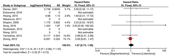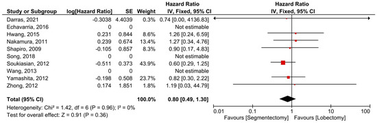Six manuscripts described data on DFS and concerned 1017 patients (391 minimally invasive segmentectomies and 626 lobectomies). There was no heterogeneity between trials (I2 = 0%, p = 0.68). The overall HR for DFS was 1.07 (95% confidence interval: 0.73–1.56). The DFS did not differ substantially between the two groups (p = 0.72, Figure 6). Seven studies presented OS data for 1520 individuals (461 minimally invasive segmentectomies and 1059 lobectomies) included in seven investigations. There was no heterogeneity between trials (I2 = 0%, p = 0.96). The combined HR for OS was 0.80 (95% confidence interval: 0.49 to 1.20). The OS did not differ substantially between the two groups (p = 0.36, Figure 7).