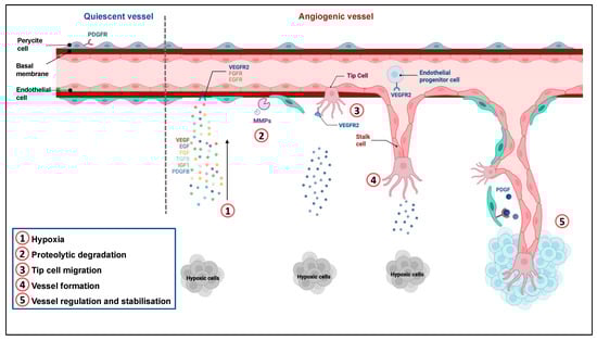 Regulation of angiogenesis. Quiescent ECs form a thin layer of single flat cells that line the interior surface of blood vessels and lymphatic vessels. These cells are interconnected by junctional molecules. EC monolayer is covered by pericytes, which control EC proliferation, release cell-survival signals and produce the basement membrane. ①. Hypoxia induces the secretion of pro-angiogenic factors. ②. This secretion leads to pericyte detachment, basement membrane degradation by metalloproteases and loss of EC junctions via VEGFR-2 activation. ③. One EC called tip cell is selected to guide elongation of the vessel towards proangiogenic signals. Remodeling of the existing matrix allows the migration of ECs. ④. Stalk cells proliferate and elongate to form a new vessel. ⑤. Following Dll4-Notch signaling and PDGF release, EC resume their quiescent state, the vessel is stabilized by recruitment of pericytes via PDGFR and deposition of a basement membrane. Adapted from “Tumor vascularization”, by BioRender.com (2022). Retrieved from https://app.biorender.com/biorender-templates (accessed on 4 December 2022).