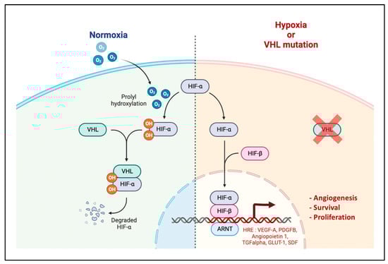 HIF Pathway. Under normoxic conditions, HIF-α is hydroxylated by prolyl hydroxylases (PHD) and then recognized by the VHL protein. Once VHL is bound to HIF-α, this leads to its ubiquitination and degradation by the proteasome. Under hypoxic conditions, HIF-α is not hydroxylized, accumulates in the cytosol, translocates to the nucleus and heterodimerizes with its subunit HIF-β. This leads to the transcription of genes with a hypoxia responsive element (HRE) in their promoter, responsible for cellular adaptation to hypoxia such as angiogenesis, survival, glucose metabolism and proliferation. Adapted from “HIF signalling”, by BioRender.com (2022). Retrieved from https://app.biorender.com/biorender-templates (accessed on 4 December 2022).
