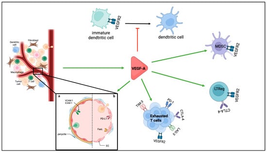 Proangiogenic factors involved in tumour angiogenesis can also promote immunosuppression by direct effects on immune cells. VEGF-A immunosuppressive role has been well described [47,48,49,50]. It inhibits the maturation of dendritic cells, with or without the help of NRP1, thus altering the presentation of tumour antigens. It favours the recruitment and proliferation of LTreg or other immunosuppressive cells such as MDSCs (myeloid-derived suppressor cells). Through its binding to VEGFR-2 expressed by CD8+ T cell, it increases the exhaustion of LT by promoting the expression of inhibitory checkpoint molecules such as PD-1, CTLA-4, LAG-3, and TIM-3. Similar immunosuppressive effects of other proangiogenic factors including hepatocyte growth factor (HGF), PDGF, and angiopoietins have also been reported [51].