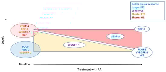 As a target of antiangiogenics, studies focused mainly on the VEGF-A pathway including VEGF-A and the soluble forms of its receptors. The baseline level of VEGF-A is often described as a prognostic factor in metastatic RCC (m-ccRCC): a high level of VEGF-A at diagnosis reflects an aggressive tumour [29,65]. It is associated with a shorter progression-free survival (PFS) and overall survival (OS) in patients with RCC treated with sunitinib and sorafenib [65,66,67,68,69,70,71] (Figure 4). VEGF-A level has also been studied in patients treated with everolimus, an mTOR inhibitor with an antiangiogenic activity, and discordant results were observed: higher levels associated with shorter survival [31] or no association [72]. A recent study evaluating lenvatinib plus everolimus versus lenvatinib alone or everolimus alone, included VEGF-A in a composite biomarker score (CBS). For the PFS score the markers studied were HGF, MIG/CXCL9, IL-18BP, IL-18, Ang-2, and for OS TIMP-1, M-CSF, IL-18BP, Ang-2, VEGF-A. Patients in high CBS score groups (with high VEGF-A levels) appeared to have improved PFS and OS with lenvatinib + everolimus combination therapy compared with everolimus monotherapy [73]. Concerning VEGF-A soluble receptors, sVEGFR-2 has been more studied than sVEGFR-1 in RCC. Low sVEGFR-2 baseline level was associated with a worse clinical outcome in m-ccRCC patients treated with sunitinib [70] whereas other studies reported no correlation, whatever TKI or everolimus [13,74,75]. Conversely, high levels of sVEGFR-1 were associated with shorter PFS and OS [70].