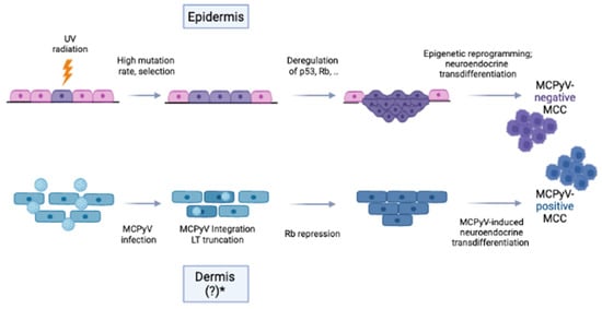 UV radiation-induced and MCPyV-induced MCC. Exposure of the skin to UV radiation (top) or integration of MCPyV DNA into the cellular genome (bottom) can induce neuroendocrine transdifferentiation and give rise to two different MCC entities. * The cell of origin for MCPyV-positive MCC is currently under debate. LT: large T-antigen; Rb: retinoblastoma protein; Figure created with BioRender.com (accessed on 5 October 2022).