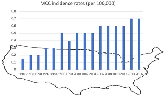 From 2006 to 2015, an average of 1972 MCC cases were diagnosed per year in the US. The relatively large number of cases allowed for the tracking of different (demographic) trends, for example, increased incidence rates with increasing age among men and women, higher incidence rates among non-Hispanic Whites, patients with localized stage, and tumors located on the head and neck [80].