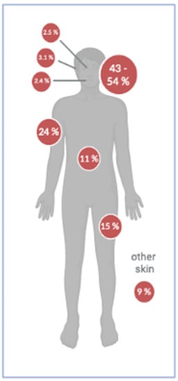 Most common body sites for MCC in percent. MCC are most commonly located on the head and neck (43–54%), followed by the upper and lower extremities (see text for references). Figure created with BioRender.com accessed on 13 December 2022.