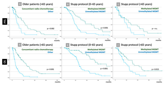 Kaplan–Meier graphs for PFS (A–C) and OS (D–F). For the older cohort (>65 years), if concomitant radio-chemotherapy was initiated or not (A,D). If concomitant radio-chemotherapy was applied, survival differences were presented in association with MGMT promotor status (MGMT) for younger (B,E) and older patients (C,F). Significance level is provided in conformity to LogRank tests. Statistically significant differences were revealed for all pairs except for concomitant radio-chemotherapy efficacy in relation to MGMT promotor status in older cohort (C).