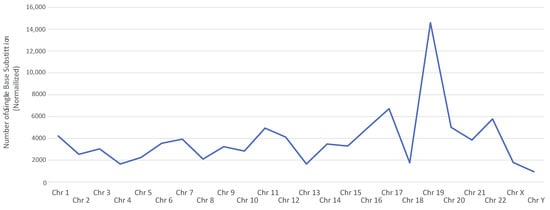 The chromosomes with the greatest frequencies of point mutations were first identified. Single base substitutions (SBS) were extracted across samples. The number and type of substitutions were averaged across patients. SBS counts were normalized by chromosome length to account for varying chromosome size. Chromosome 19 displayed a considerably greater frequency of point mutations compared to others. Chromosomes 1, 11, 17, and 22 also contained relatively high frequencies of mutation (Figure 1).