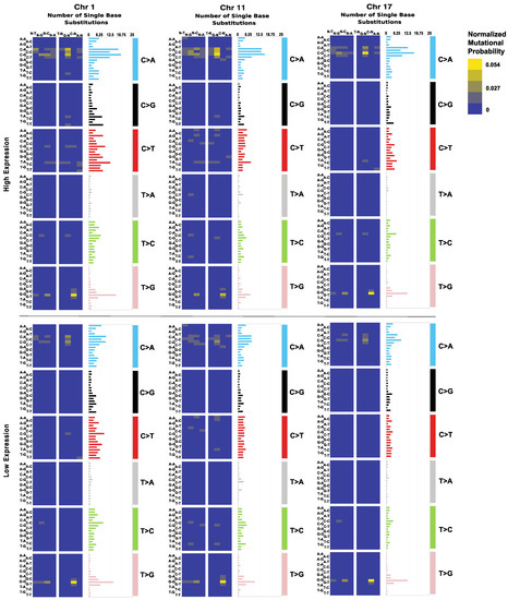 E6/E7 high- and low-expression cohorts were analyzed for point mutations by chromosome number. As mentioned above, chromosomes 1, 11, 17, 19, and 22 contained the greatest frequencies of point mutations among samples. Chromosomes 19 and 22 did not exhibit a significant difference in point mutation frequency between high- and low-expression cohorts. Chromosomes 1, 11, and 17 are believed to widely exhibit chromosomal defects in HPV+ cervical squamous cell carcinoma (CESCC) patients [14,15,16]. In samples of high E6/E7 expression, the average numbers of substitutions in chromosomes 1, 11, and 17 were found to be ~347, ~213, and ~190, respectively. In samples of low expression, these values were ~333, ~210, and ~173. Kolmogorov–Smirnov tests revealed these variances to be significant concerning chromosome 1 (p-value = 0.020), and chromosome 17 (p-value = 3.92 × 10−4). Samples of high E6/E7 expression displayed generally greater amounts of point mutations. Notably, C > A and C > T mutations in high-expression samples exceeded those in low-expression samples. T > G mutations were of greater presence in low-expression samples, however (Figure 2).