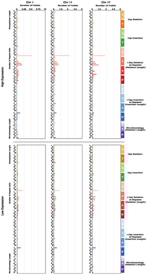 Indel counts were extracted across samples. The number and type of insertions and deletions were averaged across patients within a cohort. In E6/E7 high-expression samples, deletions > 1 bp in length were of considerably greater presence across chromosomes 1, 11, and 17; high- and low-expression deletion averages were ~18, ~8, ~9 and ~11, ~5, ~6, respectively. Insertion averages were relatively insignificant, as were microhomologous deletions (Figure 3).