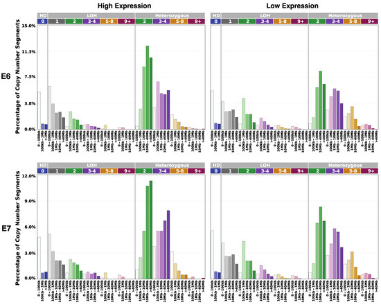 Copy number variation is a form of structural variation in which DNA segments are present in varying numbers of repeats across individuals [19]. Repeat numbers within samples were extracted and categorized by event type: heterozygous deletion (HD), heterozygous repeat, and loss of heterozygosity (LOH) [19]. HD describes complete omission of repeats within a chromosome. Heterozygous repeats describe distinct DNA repeat sections of the chromosomes in a homologous pair. LOH occurs when a repeat section of a chromosome is removed and replaced by a corresponding section of the homologous chromosome; LOH is widely believed to correlate with cancer development and progression, as hindered genetic function of a chromosome in a homologous pair can prove considerably harmful [20]. Similar for both E6 and E7 heterozygous comparisons, low expression cohorts contained generally a greater number of repeated segments, with 3–4, 5–8, and 9+ categories being heavily populated. Though many samples of high expression also contain repeats of these lengths, the presence of single repeats (two) were of significantly greater occurrence as compared to low-expression samples. Neither HD nor LOH related significantly to E6 or E7 expression (Figure 5).