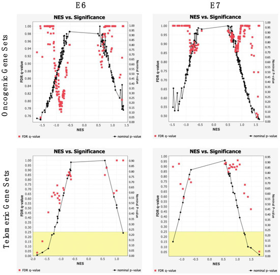 The E6 and E7 genes are widely accepted to promote oncogenesis, especially CESCC. The specific effects of these oncogenes on telomere activity and maintenance; however, are understood to a lesser extent [21,22]. Continued maintenance of telomeres may cause unregulated proliferation of tumor cells. It is suspected that E6 expression allows for increased promotion and transcription of the hTERT gene, resulting in greater telomerase activity, and therefore greater genomic stability [22]. To confirm the suspected influence of E6 and E7 expression on carcinogenesis, oncogenic and telomeric pathway activity was analyzed between samples of high and low E6 and E7 expression. Gene read counts were divided into independent E6 and E7 patient cohorts. A total of 188 oncogenic and 37 telomeric gene sets were used a reference of the known genes associated with each signaling pathway. Gene set activity was considered using nominal enrichment scores (NES), calculated based on expression counts of all genes associated within a pathway. A NES describes the extent and direction of which pathways are enriched among cohorts. Between both E6 and E7 cohorts 10 oncogenic gene sets were significantly enriched in samples of high expression (p-value < 0.05). Three telomeric gene sets were significantly enriched, with notable false discovery rates (p-value < 0.05, q-value < 0.25) (Figure 6).