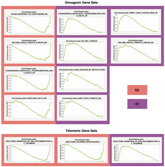Significant oncogenic and telomeric signaling pathways. Enrichment plots of several significant oncogenic and telomeric gene sets by E6/E7 expression. Enrichment scores (ESs) describe the extent of which gene sets are dysregulated across cohorts. Patients were categorized by individual E6 (pink) and E7 (purple) TPM, with TPM ≥ 10 considered high expression, and TPM < 10 low expression.