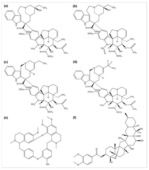 Chemical structures of (a) vinblastine, (b) vincristine, (c) vinorelbine, (d) vinflunine, (e) berbamine, and (f) veratridine.