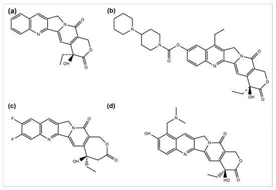 Chemical structures of (a) camptothecin, (b) irinotecan, (c) diflomotecan, and (d) topotecan.