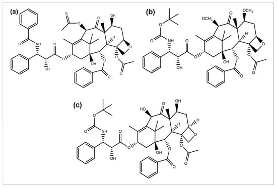 Chemical structures of (a) paclitaxel, (b) cabazitaxel, and (c) docetaxel.