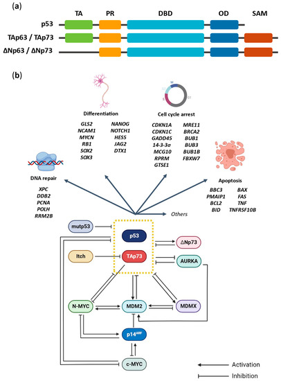 The basal levels of p53 family proteins in cellular homeostasis are usually low; however, their stability and transcriptional activity increases upon stress stimuli. Phosphorylation of the TA domain of p53 and TAp73 by ataxia telangiectasia mutated (ATM) and DNA-dependent protein kinase (DNA-PK), activates these proteins, therefore regulating the expression and activity of their downstream targets involved in distinct cellular responses to prevent the growth or migration of malignant cells [33,34,35] (Figure 1b).