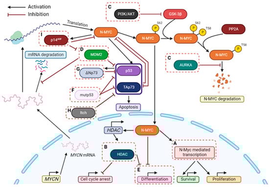 By upregulating MDM2 levels, N-MYC might also indirectly inhibit TAp73 transcriptional activity [39] (Figure 1b). Some studies have suggested that overexpression of N-MYC in NB cells could decrease the expression levels of TAp73, by repressing its transcription [39]. Conversely, when TAp73 was overexpressed, the expression levels of N-MYC were reduced, therefore promoting neuronal differentiation, which pointed to an antagonistic role of these two transcription factors in NB proliferation and differentiation [36,172].