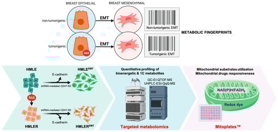 Here, we aimed to provide a comprehensive metabolomic and mitochondrial fingerprinting of the EMT phenomenon in human breast cells. We performed targeted metabolomics characterization coupled to functional mitochondrial phenotyping of the human breast EMT in non-tumorigenic and oncogenic H-RasV12-driven tumorigenic backgrounds (Figure 1). One phenotypic dimension was based on targeted analyses of metabolites representative of the catabolic/anabolic status of mitochondrial nodes and of the methionine/folate one-carbon (1C) cycle. A second phenotypic dimension was based on mitochondria-focused functional assays (MitoPlate™) that measures the rate of electron flow into and through the electron transport chain (ETC) from 31 different mitochondrial substrates that produce NAD(P)H or FADH2 as well as the mitochondrial sensitivity to a panel of 22 diverse mitochondria-centered inhibitors. We provide evidence that non-tumorigenic and tumorigenic EMT cell fate conversion is accompanied by a conspicuous but distinctive rewiring of metabolic and mitochondria functioning.