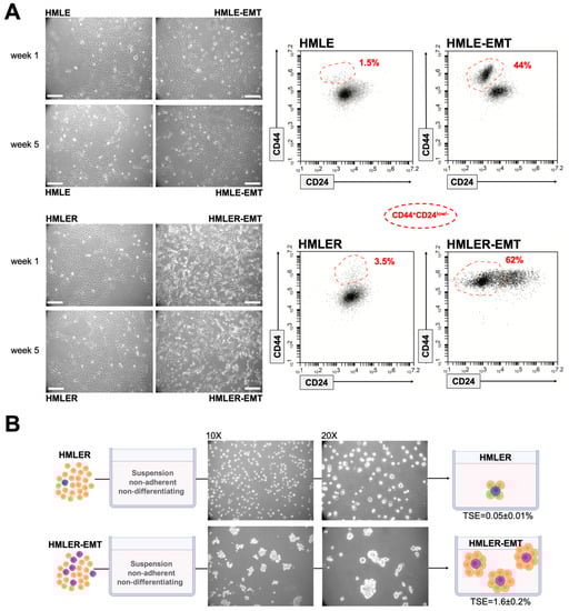 Mesenchymal and tumorigenic traits in HMLE/HMLER cells induced to undergo EMT. (A) Left: Representative phase contrast microphotographs of HMLE and HMLER cells modified by shRNA-mediated inhibition of the human CDH1 gene. Scale bar, 100 μm. Right: Representative flow cytometry plots of CD44 and CD24 expression in HMLE/HMLE-EMT and HMLER/HMLER-EMT pairs (n = 3). Red dashed line indicates the distribution of the CD44+CD24−/low subpopulation; percentage is indicated for each model. (B) Representative light microscope microphotographs of tumorspheres formed by HMLER and HMLER-EMT cells growing in sphere medium for 7 days (10X and 20X magnifications). MSFE was calculated as the number of tumorspheres (diameter > 50 μm) formed in 7 days divided by the original number of cells seeded and expressed as percentage means ± SD (n = 5 in triplicate).