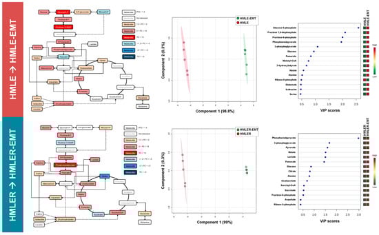 To better analyze our findings, we embedded the metabolic data from pre-/post-EMT pairs into a partial least squares discriminant analysis (PLS-DA) model to use the power of metabolite abundance in group discrimination and prevent type 2 statistical errors when analyzing data at the specific metabolite level. Metabolite-based clustering obtained by PLS-DA using two-dimensional score plots revealed a clear, non-overlapping differentiation of both HMLE-EMT and HMLER-EMT cells from HMLE and HMLER controls (Figure 3, middle panels). To identify the metabolites with the most relevant changes post-EMT, we calculated the variable importance of projection (VIP) scores as a measure of the variable’s degree-of-alteration associated with the acquired EMT status: a higher VIP score was considered more relevant in mesenchymal versus epithelial status classification. When VIP scores ≥ 1.5 in the PLD-DA model were chosen to maximize the difference of metabolic profiles between post-EMT and epithelial parental counterparts, all “6-carbon” metabolites connecting glucose to glyceraldehyde-3-phosphate (G3P) in the upper chain of the glycolytic–gluconeogenic reaction pathway (i.e., glucose-6-phosphate, fructose-6-phosphate, and fructose 1,6-bisphosphate) showed the most relevant post-EMT changes in the non-tumorigenic HMLE/HMLE-EMT pair (Figure 3, right panels). The “3-carbon” metabolites connecting G3P to pyruvate in the lower chain of the glycolytic–gluconeogenic pathway (i.e., 3-phospho-glycerate, phosphoenolpyruvate, and pyruvate) showed the greatest impact by EMT in the tumorigenic HMLER/HMLER-EMT pair (Figure 3, right panels).