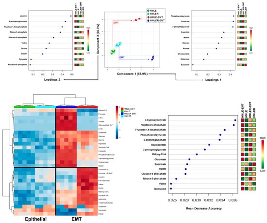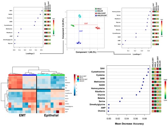 Homocysteine–methionine 1C metabolism fingerprints of non-tumorigenic and tumorigenic EMT (II). Top panels: PLS-DA showing four clusters and loading plots based on targeted homocysteine–methionine 1C metabolite profile data derived from HMLE/HMLE-EMT and HMLER/HMLER-EMT cells. Bottom panels: Heatmap visualization, hierarchical analyses, and random forest analysis of the homocysteine–methionine 1C metabolome of HMLE/HMLE-EMT and HMLER/HMLER-EMT cells. Rows: metabolites; columns: samples; color key indicates metabolite expression value (blue: lowest; red: highest). The list of the first 15 homocysteine–methionine 1C metabolites highlighted by their mean decrease accuracy value is presented for each cell model. Mean decrease accuracy is the measure of the performance of the model without each metabolite. A higher value indicates the importance of such metabolite in predicting each cell line group; removal of that metabolite causes the models to lose accuracy in prediction.
