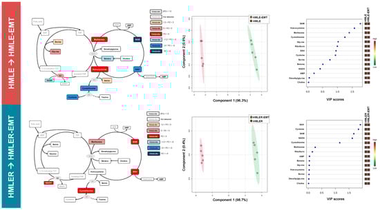 Homocysteine–methionine 1C metabolism fingerprints of non-tumorigenic and tumorigenic EMT (I). Left panels: Homocysteine–methionine 1C metabolites from non-tumorigenic HMLE-EMT and tumorigenic HMLER-EMT mesenchymal cells were extracted and quantitatively analyzed by UHPLC-ESI-QqQ-MS/MS and compared with those of non-tumorigenic HMLE and tumorigenic HMLER parental counterparts. Significantly increased and decreased metabolites (EMT vs. epithelial controls) are shown using brown-red and light blue-dark blue color scales, respectively. Middle panels: Two-dimensional score plots of the partial least square discriminant analysis (PLS-DA) models of the UHPLC-ESI-QqQ-MS/MS-based homocysteine–methionine 1C metabolomic profiling of HMLE/HMLE-EMT and HMLER/HMLER-EMT cells. The X and Y axes represent the combinations of the different 1C metabolites analyzed, showing the maximum separation between groups. Right panels: Key 1C metabolites separating the homocysteine–methionine 1C metabolomic profiles of HMLE/HMLE-EMT and HMLER/HMLER-EMT cells based on variable importance in projection (VIP) in PLS-DA analysis described in the middle panels. The VIP score, which is calculated as a weighted sum of the squared correlations between PLS-DA components and the original variable, summarizes the contribution of the metabolites’ importance in the PLS-DA model. The number of terms in the sum depends on the number of PLS-DA components found to be significant in distinguishing the classes.