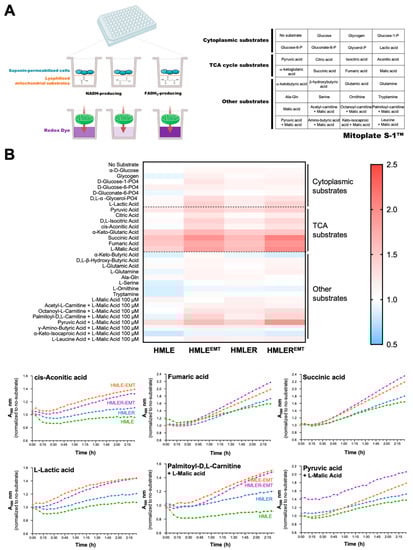 The electrons donated to complex I or complex II travel to the distal end of the ETC where a tetrazolium redox dye acts as a terminal electron acceptor and changes from colorless to a purple formazan upon reduction. Thus, each of the 96 assays concurrently run in the MitoPlate S-1™ provides different information as substrates follow different metabolic routes using various transporters to enter the mitochondria, and different dehydrogenases to produce NADH or FADH2. Heatmap analysis of the metabolic substrate consumption in HMLE/HMLE-EMT and HMLER/HMLER-EMT pairs is presented in Figure 7B. Results revealed a significant augmentation in the utilization of TCA cycle substrates such as cis-aconitic acid, fumaric acid, and succinic acid, in both non-tumorigenic HMLE-EMT and tumorigenic HMLER-EMT cells. Both HMLE-EMT and HMLER-EMT cells utilized other substrates including lactic acid and malic acid-containing combinations such as malic acid + the fatty acid ester palmitoyl–carnitine and malic acid + pyruvic acid, with the latter particularly utilized by mitochondria of HMLER-EMT cells.