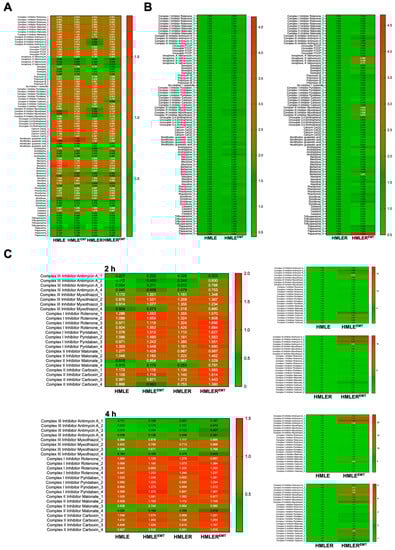 Responsiveness of non-tumorigenic and tumorigenic EMT to mitochondrial-centered drugs. Representative phenetic maps of HMLE/HMLE-EMT and HMLER/HMLER-EMT cells growing in the presence of graded concentrations of mitochondria-centered drugs during 48 h, generated after normalization of the optical density values of each drug concentration at 590 nm (purple color) to those of the positive-control wells included in the MitoPlate™ I-1 plates (A) or calculating the absolute ratio between the optical densities at 590 nm of HMLE (=1.0) vs. HMLE-EMT and HMLER (=1.0) vs. HMLER-EMT cells (n = 3) (B,C) Representative phenetic maps of the 2 h (top) and 4 h (bottom) mitochondrial activity in saponin-permeabilized HMLE/HMLE-EMT and HMLER/HMLER-EMT cells in the presence of succinate and complex I, II, and III inhibitors (n = 3).