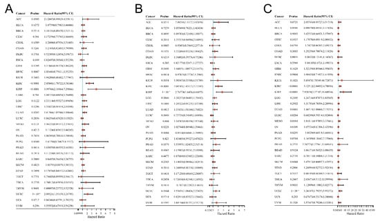 The RNA-sequencing expression (level 3) profiles and corresponding clinical information for 33 tumors were downloaded from the TCGA dataset (https://portal.gdc.com) (accessed on 15 December 2022). [13,14]. The univariate Cox regression analysis and the forest were used to show the p value, HR, and 95% CI of each variable through the ‘forestplot’ R package. All analysis methods and the R package were implemented by R version 4.0.3 [15]. If not stated otherwise, the two-group data were performed using the Wilcox test [16]. The survival outcomes included the overall survival (OS), progression-free survival (PFS), and disease-specific survival (DSS).