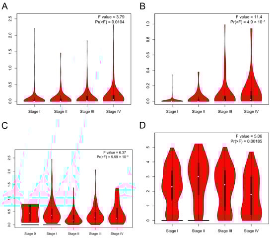 Correlation between the expression of DMRT3 in pan-cancer tumors and the pathological stage. (A) KIRC, (B) KIRP, (C) SKCM, and (D) THCA.