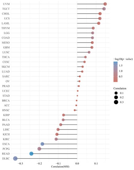 Correlation between the DMRT3 expression and microsatellite instability (MSI) in pan-cancer tumors (Spearman analysis). The horizontal coordinates represent the correlation coefficients between the DMRT3 gene and the MSI, the vertical coordinates are different tumors, the size of the dots in the figure represents the correlation coefficients, and the color of the dots represents the significance of the p-value, with blue representing a smaller p-value.