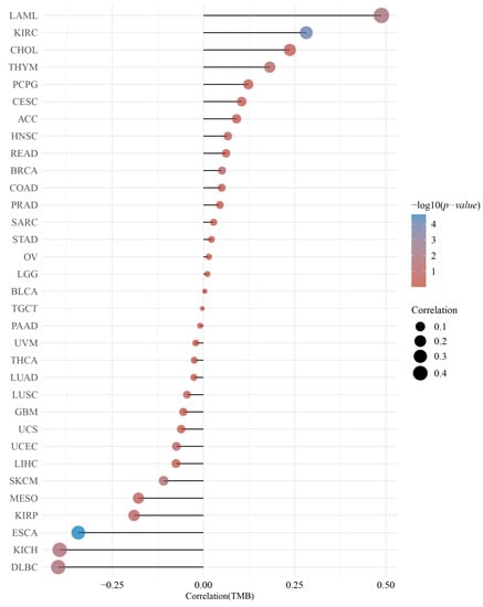 GEPIA2 was used to investigate the relationship between the DMRT3 expression and tumor pathological stage. A high expression of DMRT3 was significantly associated with the advanced stages of KIRC, KIRP, SKCM, and THCA (Figure 3). The MSI occurs when some cells perform one or two alleles and a varying number of repeats and has been identified to correlate with clinicopathological features of cancer patients [31]. The TMB is the number of non-synonymous mutations per coding region of the tumor genome, including the somatic variants per megabase (MB) of the genome, identified by the reported algorithm for the whole exome sequencing [32]. As shown in Figure 4, the DMRT3 expression was negatively correlated with the MSI status of DLBC (p = 0.026), ESCA (p = 0.023), and READ (p = 0.013). As shown in Figure 5, the DMRT3 expression was positively correlated with the TMB status of KIRC (p < 0.001) and LAML (p = 0.009), and negatively correlated with the TMB status of DLBC (p = 0.017), ESCA (p < 0.001), KICH (p = 0.016), and SKCM (p = 0.020). Overall, these results identify DMRT3 as a potential prognostic biomarker for various cancer types.