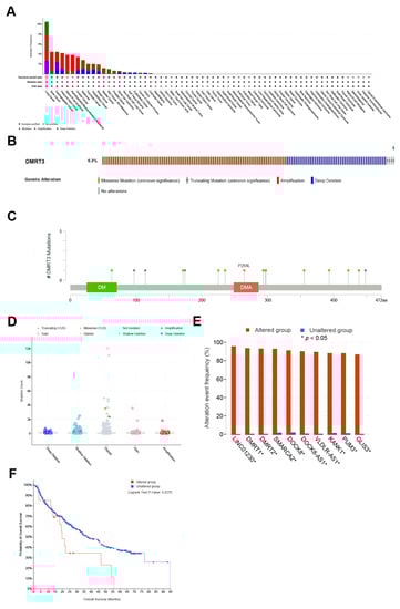 Genetic alterations in DMRT3. (A) Summary of the DMRT3 changes in the TCGA pan-cancer dataset. (B) Structure variants, mutations, and copy number alterations in DMRT3. (C) A description of the types, number, and location of the mutations in the DMRT3 gene. (D) DMRT3 alterations in pan-cancer. (E) Frequency of the gene alterations associated with the DMRT3 altered and unaltered groups. (F) Overall survival between DMRT3 altered group and DMRT3 unaltered group in pan cancer.