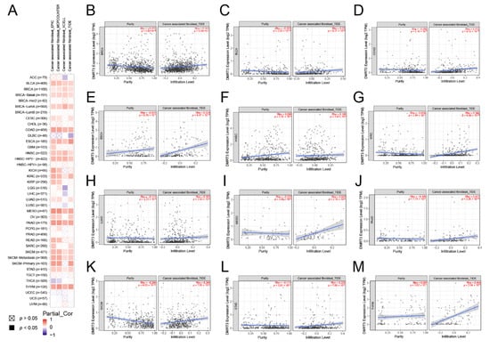 Correlation of the DMRT3 expression with cancer-associated fibroblasts (CAF) in pan-cancer tumors. (A) Correlation analysis between the DMRT3 expression and CAF was performed using TIMER2.0. (B) BLCA. (C) BRCA. (D) COAD. (E) ESCA. (F) HNSC. (G) KIRC. (H) LUAD. (I) MESO. (J) PAAD. (K) SKCM. (L) STAD. (M) THYM.