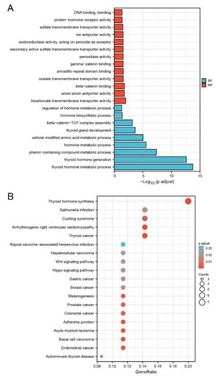 To investigate the possible mechanisms of the DMRT3 action in pan-cancer, we extracted the top 100 genes with expression patterns similar to DMRT3, using GEPIA2 from the TCGA dataset, and obtained 16 genes co-expressed with DMRT3 using the STRING tool. We performed GO and KEGG analyses on these 116 genes. As shown in Figure 9A, the results showed five significantly related biology processes, including the thyroid hormone metabolic process, thyroid hormone generation, phenol-containing compound metabolic process, hormone metabolic process, and cellular modified amino acid metabolic process, as well as five significantly related molecular functions, including bicarbonate transmembrane transporter activity, anion: anion antiporter activity, beta-catenin binding, oxalate transmembrane transporter activity, and armadillo repeat domain binding. As shown in Figure 9B, five pathways including the thyroid hormone synthesis, thyroid cancer, arrhythmogenic right ventricular cardiomyopathy, endometrial cancer, and basal cell carcinoma, may be the main pathways involved in the development of pan-cancer by DMRT3.