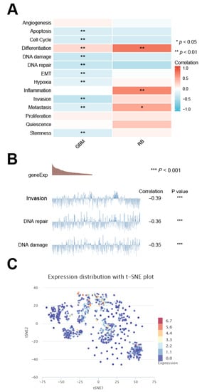 CancerSEA (http://biocc.hrbmu.edu.cn/CancerSEA/home.jsp) (accessed on 15 December 2022) is a specialized single-cell sequencing database that provides different functional states of cancer cells at the single-cell level [26]. We downloaded the single cell sequencing data, based on CancerSEA, the correlations between the DMRT3 expression, and the different tumor functional states and plotted heat maps. The t-SNE maps of all individual cells were obtained directly from the CancerSEA website.