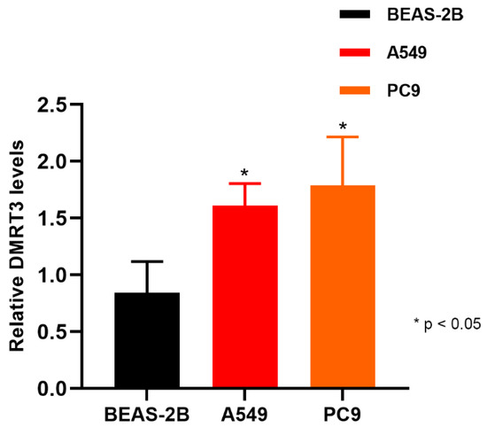 Our laboratory preserved the LUAD cell lines, the A549 and PC9 cells, as well as the human normal lung epithelial cell line BEAS-2B, for use in this study. To identify the DMRT3 levels in the A549, PC9, and BEAS-2B cell lines, a qRT-PCR was performed, according to [9,27]. The primer sequences used are as follows. GAPDH, Forward: CGACAGTCAGCCGCATCTTC, Reverse: CGTTCTCAGCCTTGACGGTG; DMRT3, Forward: 5′-GGTTCTCCTCGGCCCAGA-3′, Reverse: 5′-GCCGATCGGACGGGCGT-3′.