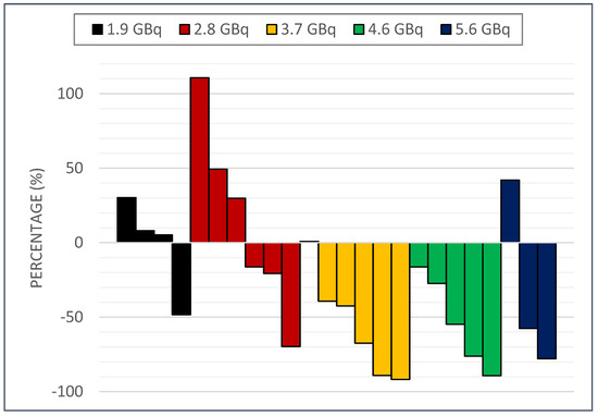 The detailed PSA levels at weeks 1, 2, 3, 4, 6, 8, and 12 after [177Lu]Ludotadipep administration are shown in Supplementary Table S4. At 12 weeks, the 1.9 GBq and 2.8 GBq groups showed increases of 15.15 and 5.00 ng/mL in median absolute PSA levels, respectively, compared to baseline. In the 3.7 GBq and higher dose groups, decrease in median PSA level was observed compared to the baseline values. Among the dose groups, the 5.6 GBq treated group had the greatest drop in the median absolute PSA level of 87.00 ng/mL from baseline to 12 weeks.