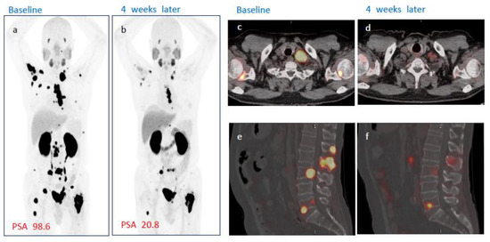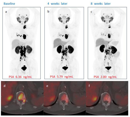 A case of a subject showing PSA response to [177Lu]Ludotadipep. (a,d) Baseline [18F]Florastamin PSMA PET/CT maximum intensity projection (MIP) and fused axial images with multiple bone and lymph node metastases. (b,c) PSMA PET/CT MIP images at four and eight weeks after administration of [177Lu]Ludotadipep showing decreased tumor burden. (e,f) Axial fused PSMA PET/CT images at four and eight weeks show decreased uptake in metastatic lesion in the thoracic vertebra. The patient’s PSA decreased from 6.36 to 2.00 ng/mL at 8 weeks.