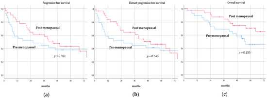 Progression-free survival (a), distant progression-free survival (b), and overall survival (c) curves of de novo metastatic breast cancer patients according to menopausal status.