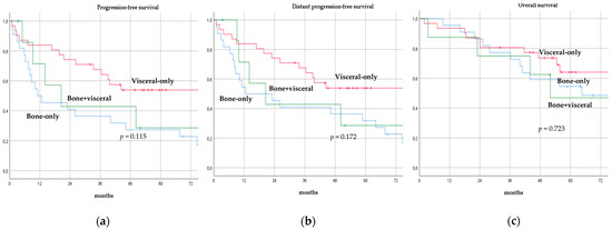 Progression-free survival (a), distant progression-free survival (b), and overall survival (c) curves of de novo metastatic breast cancer patients according to location of metastases.