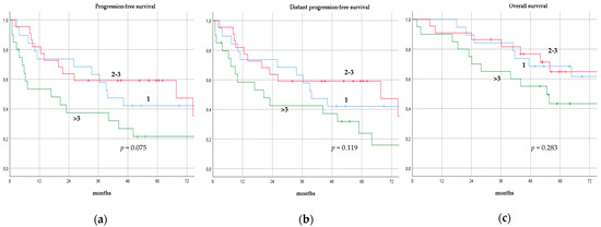 Progression-free survival (a), distant progression-free survival (b), and overall survival (c) curves of de novo metastatic breast cancer patients according to number of metastases.